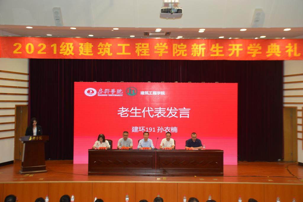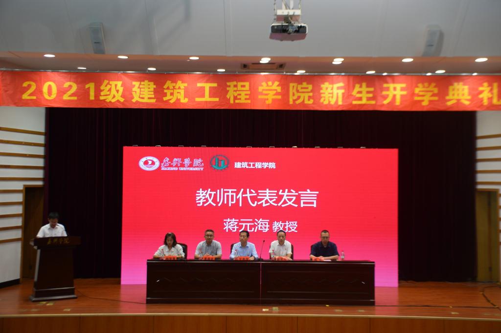 伴随着雄壮的国歌,2021级新生开学典礼正式开始。首先由教师代表、浙江省高校优秀共产党员蒋元海发言,他表达了广大教师对学子的殷切期望和关怀之情;在校生代表、院员工会主席团成员孙衣楠表达了学长学姐对新生的亲切关怀;新生代表建筑212李海星表达了要在大学时光里发奋努力、立志成才的坚定决心和强烈愿望;优秀员工代表——浙江一舟建设管理有限公司董事长殳耀忠结合自身学习与工作的经历,分享了他的人生感悟,鼓励同学们充分享受大学时光,用不懈奋斗来谱写青春华章。经理王恩茂向同学们分享了对大学的认识,也对同学们即将开始的老员工活提出了希望和要求。