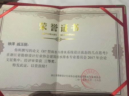 10月26-27日,浙江省勘察设计行业协会建筑给水排水专业委员会2017年会在宁波召开,由公司戚玉丽老师(指导教师)和建环专业徐泽同学合作完成的《87型雨水斗排水系统设计流态的几点思考》荣获论文三等奖。