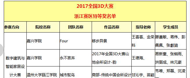 公司在2017年全国3d大赛浙江赛区决赛中取得大丰收,一共收获15组奖项。其中浙江赛区特等奖2项,浙江赛区一等奖4项,浙江赛区二等奖6项,浙江赛区三等奖3项。按照3D大赛要求,进入浙江赛区特等奖的2组作品将参加全国3d大赛总决赛。这2组作品分别是由员工滕晨敏、蒋伟、彭佩佩、张叡涵组成的“Four队”参赛的作品“移步异景”,指导教师为王荟荟和金荣科;另一组是由易新童、张烟雨、洪弼成、林元豪组成的“永不言弃”队参赛的作品“2017年全国3D大赛山地会所设计-韵”,指导教师为王德海。预祝进入全国总决赛的作品取得更好成绩。