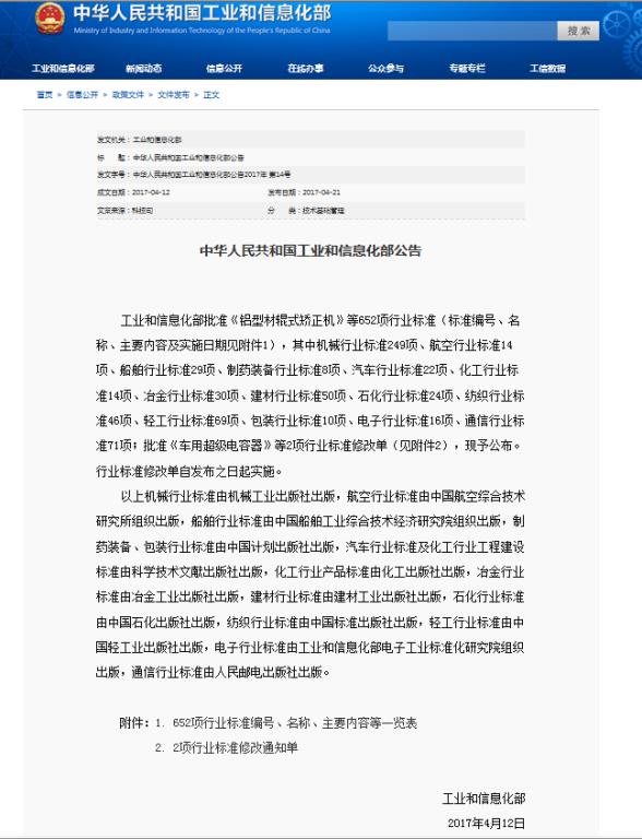 据工业和信息化部政府网站最新公告,工业和信息化部批准发布《电动汽车用动力蓄电池箱通用要求》等652项行业标准。其中, 由嘉兴公司刘红飞教授负责完成的《预拌砂浆用保水剂》(JC/T 2389-2017)、《水泥基泡沫保温板专用砂浆》(JC/T 2390-2017)等2项建材行业标准,上述2项标准将于2017年10月1日起实施。