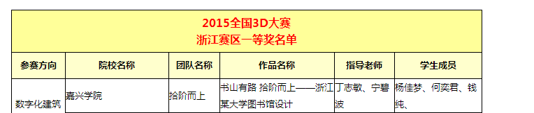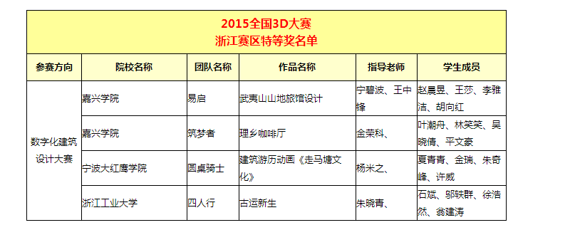 近日,2015年全国三维数字化创新设计大赛(简称“全国3D大赛”)浙江赛区复赛结果揭晓,公司选送的9组作品经过初赛、复赛的层层选拔,全部获奖。其中由金荣科老师指导的“筑梦者”队以及由王中锋老师、宁碧波老师指导的 “易启”队两件作品获浙江赛区特等奖,由丁志敏老师、宁碧波老师指导的“拾阶而上”队的作品获一等奖,另有五件作品获二等奖,一件作品获三等奖。获本次大赛特等奖的公司代表队将与浙江工业大学、浙江理工大学、浙江师范大学等高校代表队参加全国总决赛。