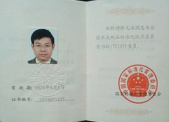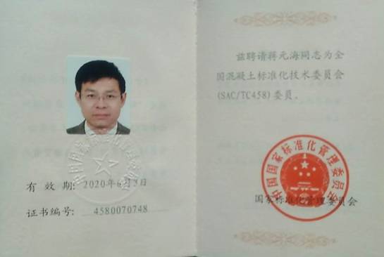 日前,公司经理兼党委书记蒋元海教授收到国家标准化管理委员会颁发的“全国混凝土标准化技术委员会(SAC/TC458)”委员证书(证书编号4580070748)和“全国水泥制品标准化技术委员会(SAC/TC197)”委员证书(证书编号1970071655)。