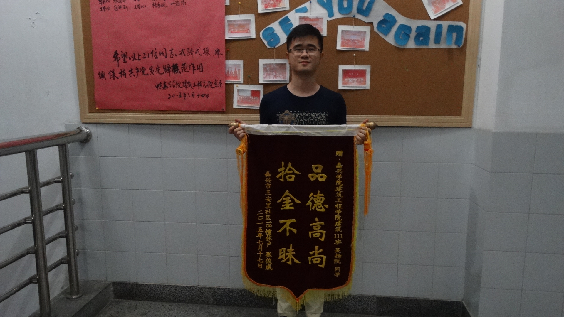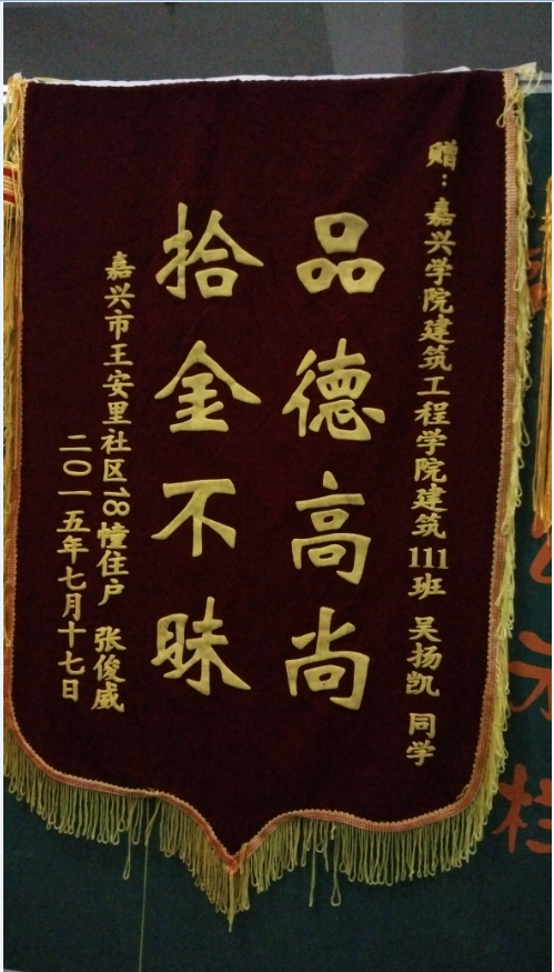 2015年暑假期间3044永利收到一面内容为“拾金不昧 品德高尚”的锦旗。送锦旗的是嘉兴市王安里社区的居民张俊成先生,张先生要表达谢意的对象是3044永利建筑111班吴扬凯同学。在得知了这件事情之后,我们诚恳邀请到吴扬凯同学做了一次专访,了解到了事情的来龙去脉。
