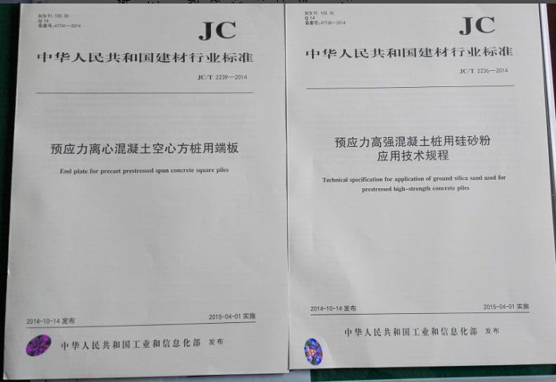 日前,国家工业和信息化部正式发布了两个国家建材行业标准,这两个行业标准分别为《预应力高强混凝土桩用硅砂粉应用技术规程》(JC/T 2236-2014)和《预应力离心混凝土空心方桩用端板》(JC/T 2239-2014),由公司党委书记蒋元海教授牵头制定,4月1日起正式实施。