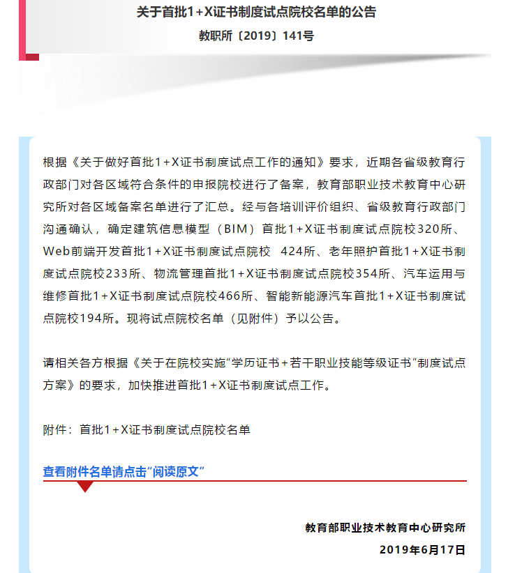为深入贯彻党的十九大精神,按照全国教育大会部署和落实《国家职业教育改革实施方案》(简称“职教20条”)要求,教育部会同国家发展改革委、财政部、市场监管总局制定了《关于在院校实施“学历证书+若干职业技能等级证书”制度试点方案》,建筑信息模型(BIM)是首批六个试点领域之一,公司成为首批建筑信息模型(BIM)1+X证书制度试点院校。