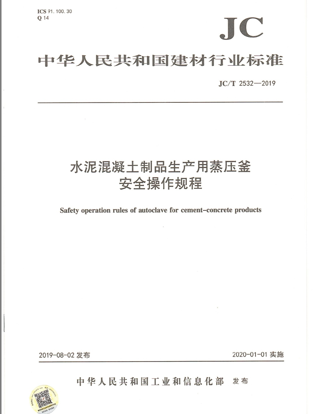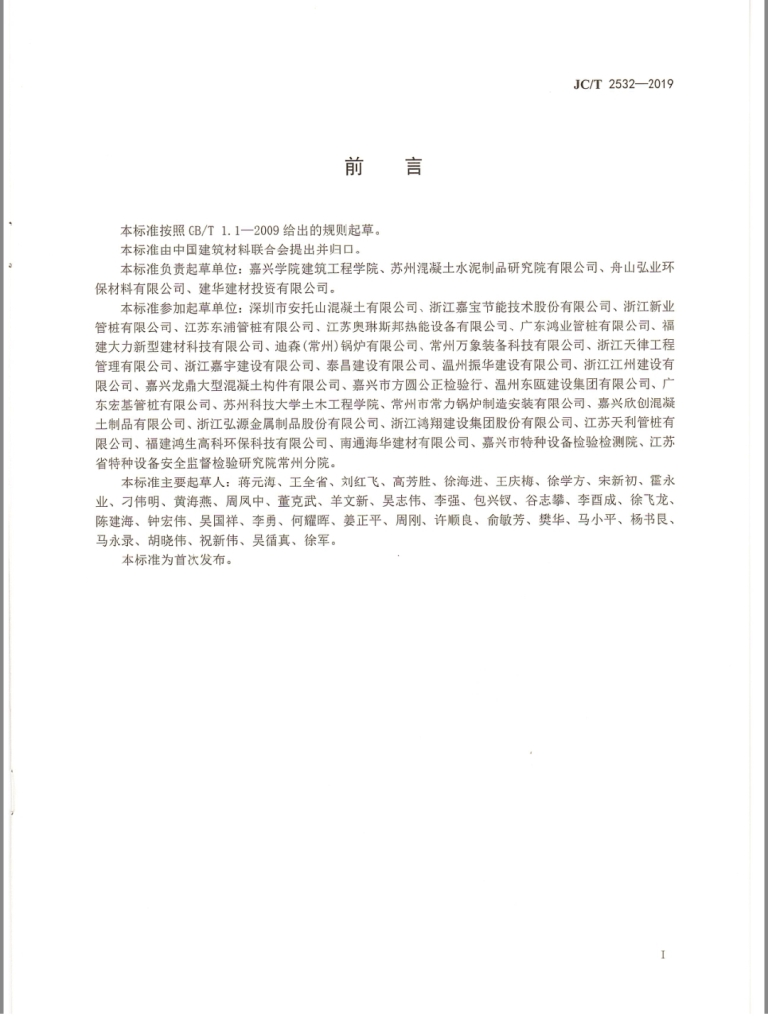 根据中华人民共和国工业和信息化部公告2019年第29号公告,由嘉兴公司蒋元海教授负责起草的《水泥混凝土制品生产用蒸压釜安全操作规程》为中华人民共和国建材行业标准,标准编号为JC/T 2532-2019,自2019年 8月2日发布,2020年1月1日实施。