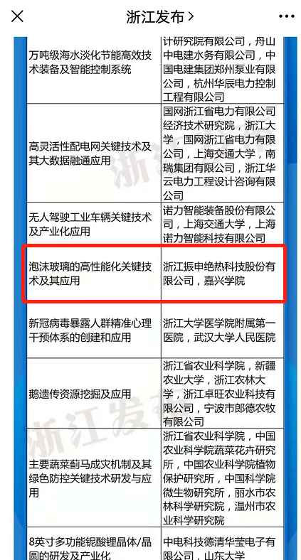 此获奖项目由浙江振申绝热科技股份有限公司牵头,嘉兴公司3044永利参与完成。项目攻克了长期困扰泡沫玻璃高性能制造、装配式应用的三大关键技术:基于废旧玻璃的泡沫玻璃高性能高稳定性制备技术、复杂形状的泡沫玻璃部品部件高效生产技术、适用于装配式应用的泡沫玻璃保温装饰防火一体板及其构造技术,实现了高性能泡沫玻璃的国产化及其应用,成果“达到了国际同类研究的领先水平”。此项目已授权专利26项,其中国际发明专利14项,发表论文6篇,制定国家标准1项,行业标准2项,浙江制造标准1项。
