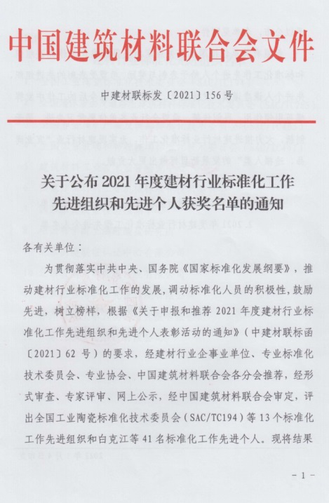 日前,中国建筑材料联合会公布了2021年度建材行业标准化先进组织和先进个人获奖名单,公司3044永利蒋元海教授获评“2021年度全国建材行业标准化工作先进个人”。