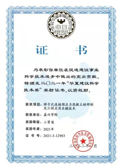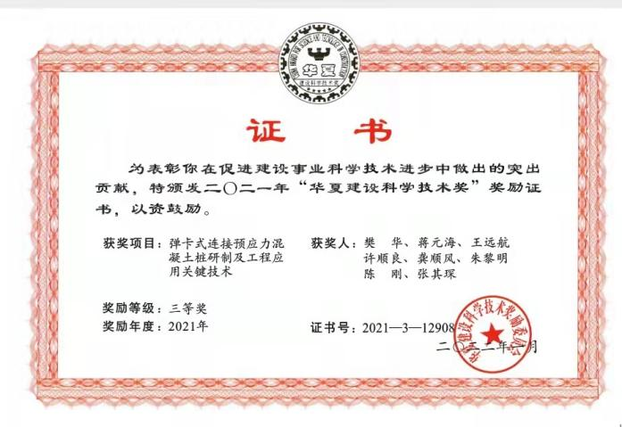 日前,华夏建设科学技术奖励委员会颁发2021年度获奖项目。公司蒋元海教授参与完成的“弹卡式连接预应力混凝土桩研制及工程应用关键技术”科技成果荣获“2021年度华夏建设科学技术奖”三等奖,嘉兴公司为成果的第三完成单位,蒋元海教授为成果的第二完成人。