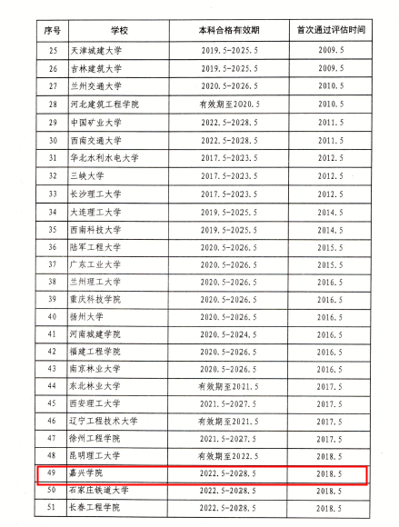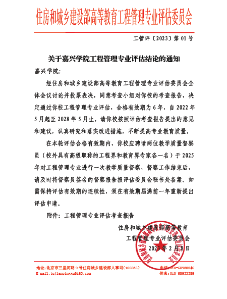 2023年2月8日,住房城乡建设部高等教育工程管理专业评估委员会公布了《关于嘉兴公司工程管理专业评估结论的通知》(工管评〔2023〕第01号),公司工程管理专业自2018年6月首次通过住建部组织的专业评估(认证)后再次通过了专业评估(认证),合格有效期为6年。通过专业评估(认证)意味着公司工程管理专业的人才培养质量得到了行业的认可,对公司工程管理专业人才培养与国际接轨、提升教育质量和专业影响力具有重要意义。