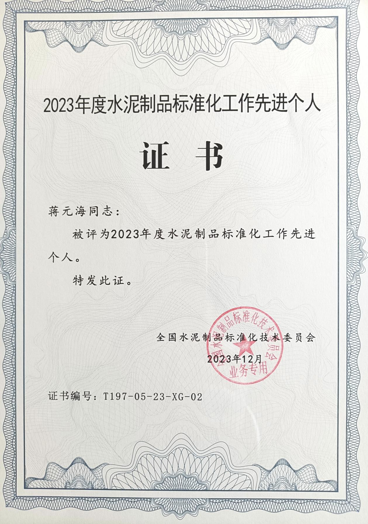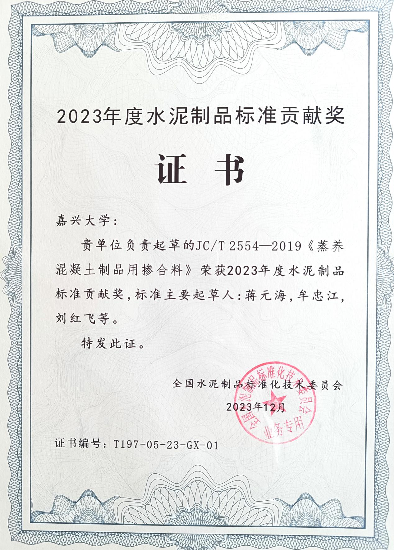 会议期间对2023年度全国水泥制品标准化领域的标准贡献奖、标准化先进个人和标准化先进集体等进行了隆重表彰。由公司负责起草的《蒸养混凝土制品用掺合料》行业标准(JC/T 2554—2019)成果荣获标准贡献奖 ,蒋元海老师荣获标准化先进个人。
