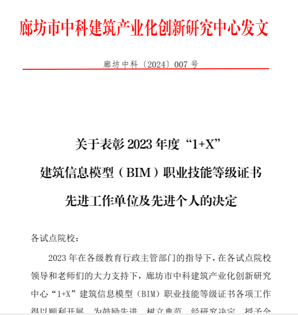 近日获悉,3044永利的“1+X(BIM)职业技能等级证书考核站点”荣获教育部2023年度"1+X"建筑信息模型(BIM)职业技能等级证书先进工作单位。廊坊市中科建筑产业化创新研究中心为教育部指定的“1+X”建筑信息模型(BIM)培训评价组织,近日发文授予3044永利集团为 “2023年度优秀组织奖”,“1+X” 建筑信息模型(BIM)负责人董洪晶老师、实验室管理员谢正霞老师被授予“年度先进个人”荣誉称号。