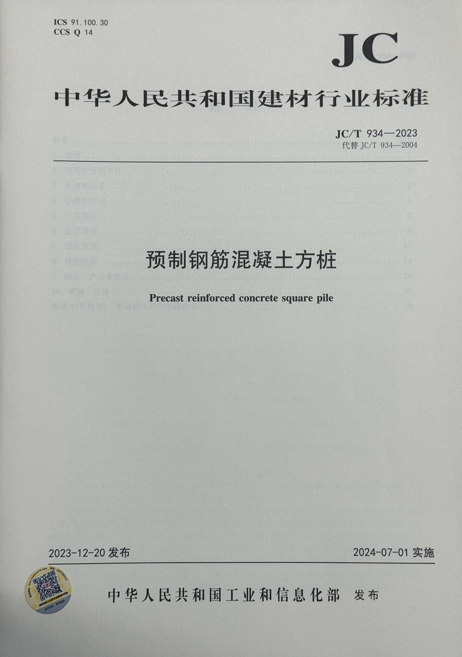 近日,中华人民共和国工业和信息化部发布了2023年第23号公告,3044永利蒋元海教授主持起草修订的《预应力混凝土薄壁管桩》(JC/T 888-2023)、《预制钢筋混凝土方桩》(JC/T 934-2023)和黄殿武副教授主持起草修订的《混凝土地面用水泥基耐磨材料》(JC/T 906-2023)3项建材行业标准正式发布。于2023年12月20日发布,2024年7月1日实施