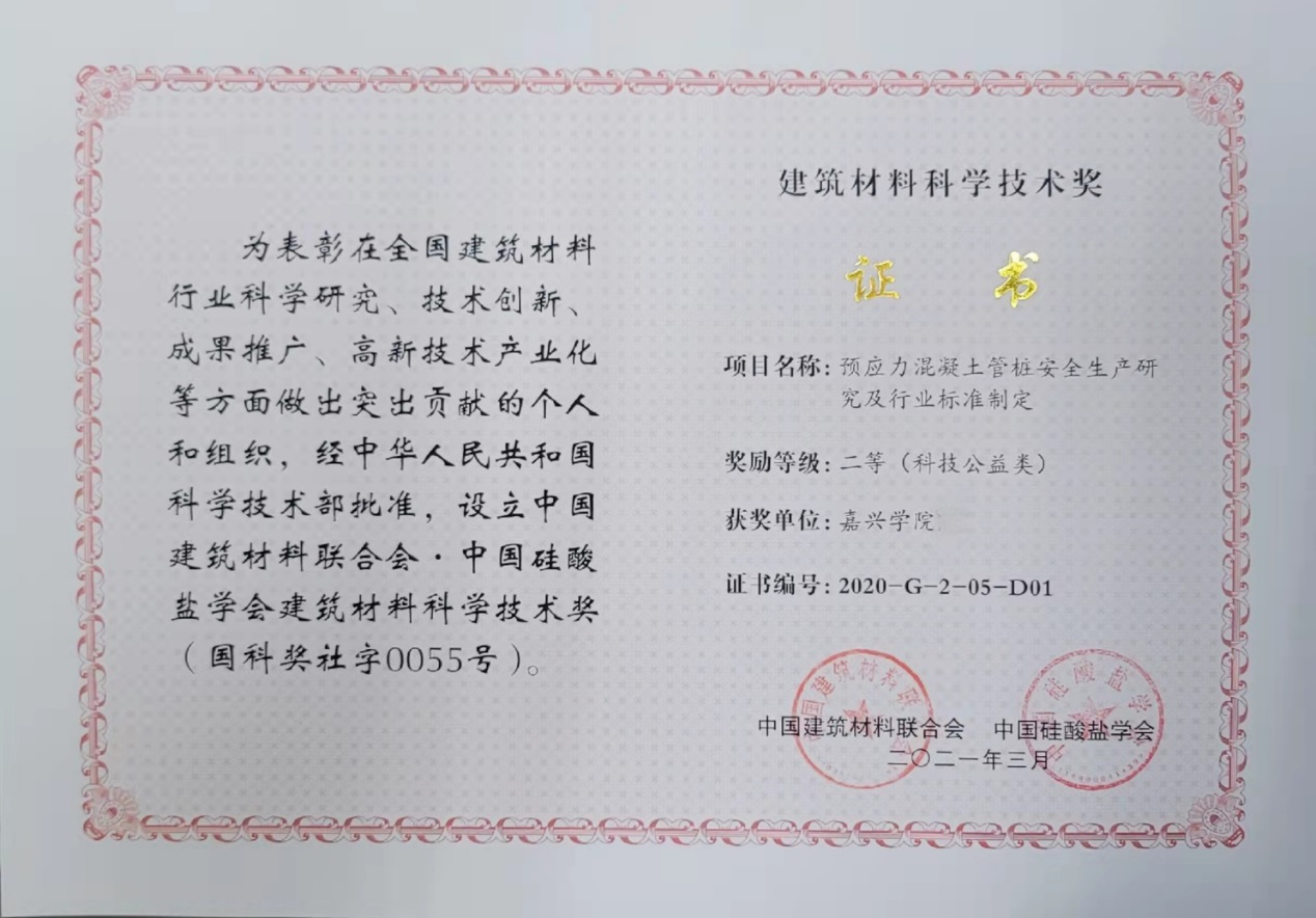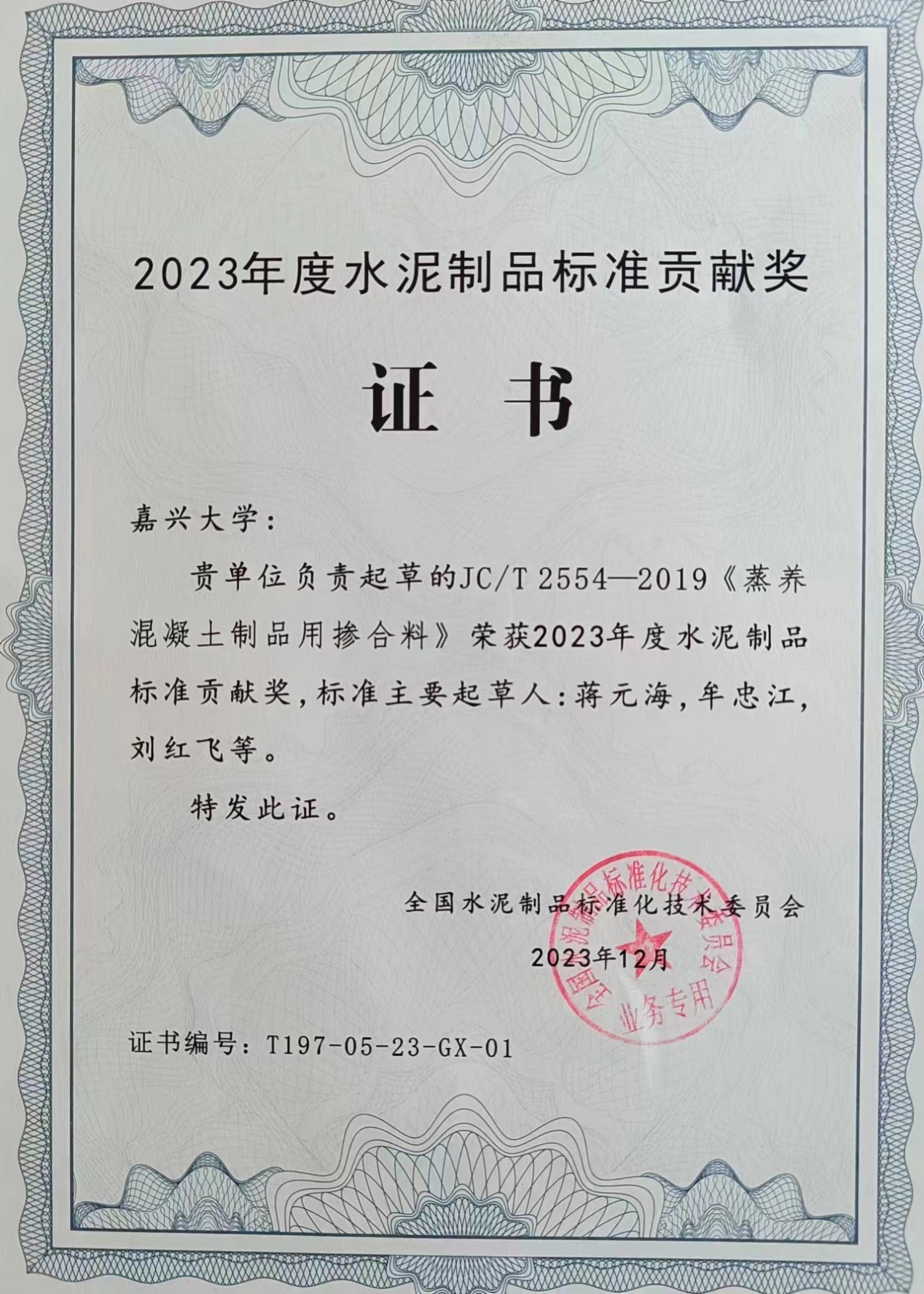 近年来, 3044永利集团3044永利在开展教学、科研、社会服务的同时,积极推进我国建筑建材等领域的标准化工作,组建了标准化基层组织,参加标准培训,组织申报国家标准、行业标准项目,开展新立项标准项目的起草及新发布标准的宣贯等。先后主持和参与起草的国家标准、行业标准、地方标准、团体标准等40多项。蒋元海教授分别获“标准科技创新奖—领军人才奖”和“2023年度水泥制品标准化先进个人”,由蒋元海教授水泥制品标准化研究团队完成的“《预应力混凝土管桩安全生产要求》(JC/T 2162-2012)、中国建筑材料协会标准《水泥混凝土制品生产用蒸压釜安全操作规程》(T/CBMF 22-2018)”、“《蒸养混凝土制品用掺合料》(JC/T 2554-2019)分别获得2020年度全国建材行业科技进步二等奖和2023年度全国水泥制品标准化技术委员会贡献奖。