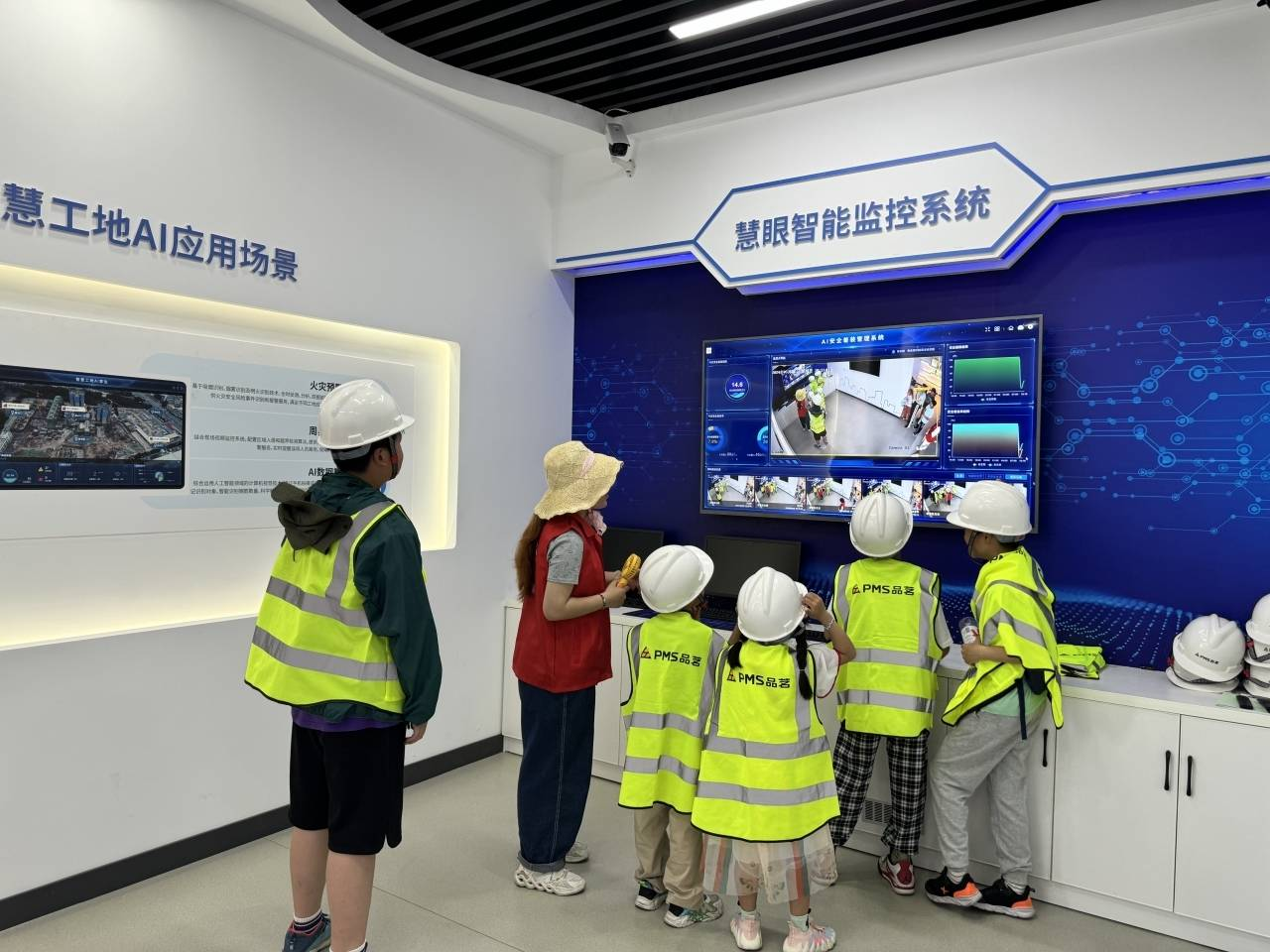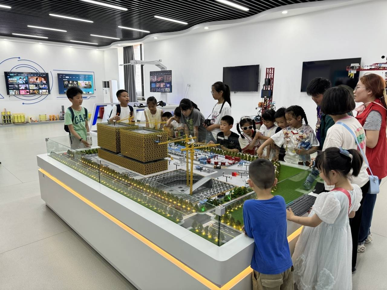 接着,小朋友们走进兴德北楼参观建工公司智慧智能建造中心,微观模拟建筑工程数字化系统与场景建筑工地。从入口的规范安全设施佩戴警示系统,到智能塔吊模型,再到整体智慧工地沙盘,每一个细节都展示了工程的神奇与魅力。孩子们也身临其境地感受未来建工的魅力,眼中闪烁着好奇与兴奋的光芒。