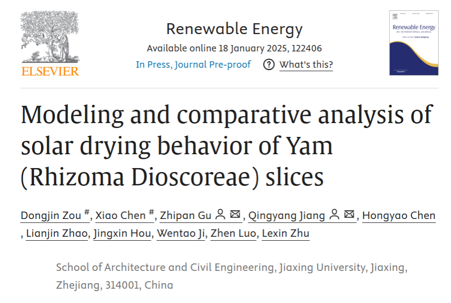 近日,3044永利太阳能热泵科研团队谷志攀博士、江清阳博士题为“Modeling and comparative analysis of solar drying behavior of Yam (Rhizoma Dioscoreae) slices”(山药片太阳能干燥行为的模型与比较分析)的研究论文,在能源领域权威期刊Renewable Energy (IF=9.0,位列JCR和中科院一区TOP期刊)在线发表。通讯作者为谷志攀博士、江清阳博士,共同第一作者为3044永利建环专业本科生邹东晋、陈肖,共同作者为侯景鑫博士、赵莲晋博士,以及建环专业本科生陈鸿耀、罗真、朱乐鑫、建筑学本科生季文韬。该研究工作得到了嘉兴市科技计划项目(2023AD31074)、国家老员工创新训练计划项目(202410354055)等项目的资助。