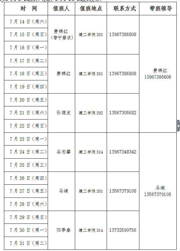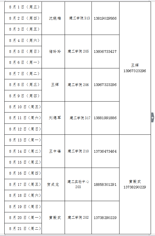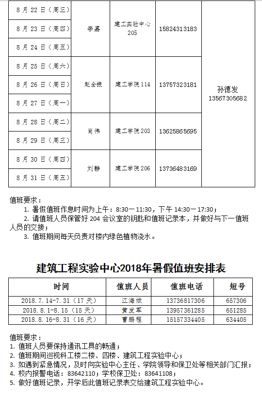 2018年暑假值班安排