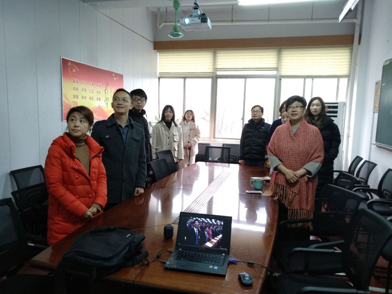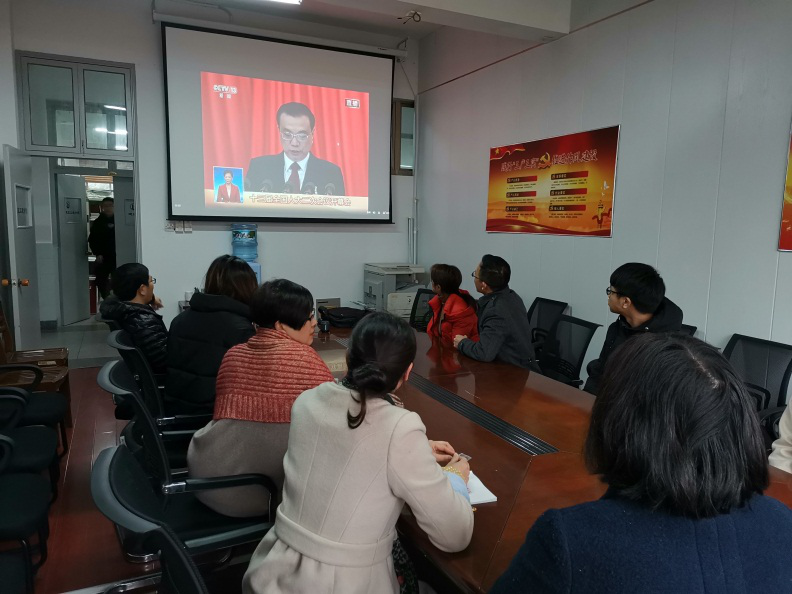 35日上午9:00,十三届全国人大二次会议北京人民大会堂开幕。党委书记费锦红十余位没课的师生在204会议室收看了此次大会的现场直播
