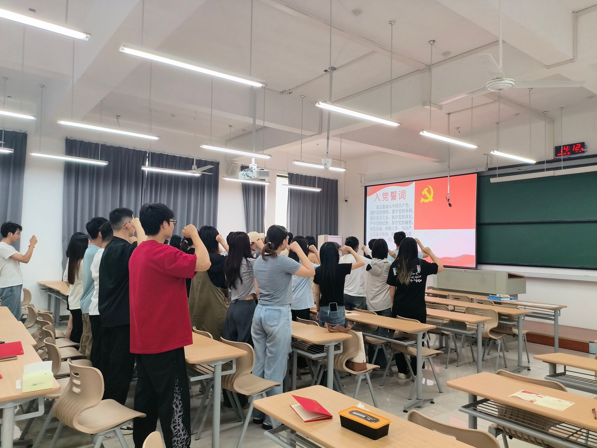 接着,在毕业生党员代表鉏陈伊同志的带领下,全体党员重温入党誓词:“我志愿加入中国共产党,拥护党的纲领,遵守党的章程,履行党的义务,执行党的决定,严守党的纪律,保守党的秘密,对党忠诚,积极工作,为共产主义奋斗终身,随时准备为党和人民牺牲一切,永不叛党。”铮铮誓言铿锵有力,向党组织表达了共产党员始终坚定跟党走的信心和决心。