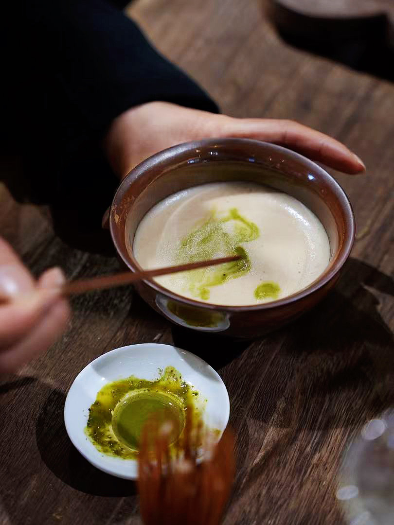 随后,进入点茶实操环节。桌上整齐摆放着茶碾、茶罗、茶筅、建盏等精致茶具。老师们跟随指导,亲手体验炙茶、碾茶、罗茶、候汤、点茶等传统技艺。大家在茶艺师的指导下专注而投入。只见她们轻碾茶叶,细细筛罗,手法逐渐娴熟;注入热水,快速搅动茶筅,茶汤泛起细腻洁白的泡沫,宛如瑞雪,体悟“以茶修身”的东方智慧。