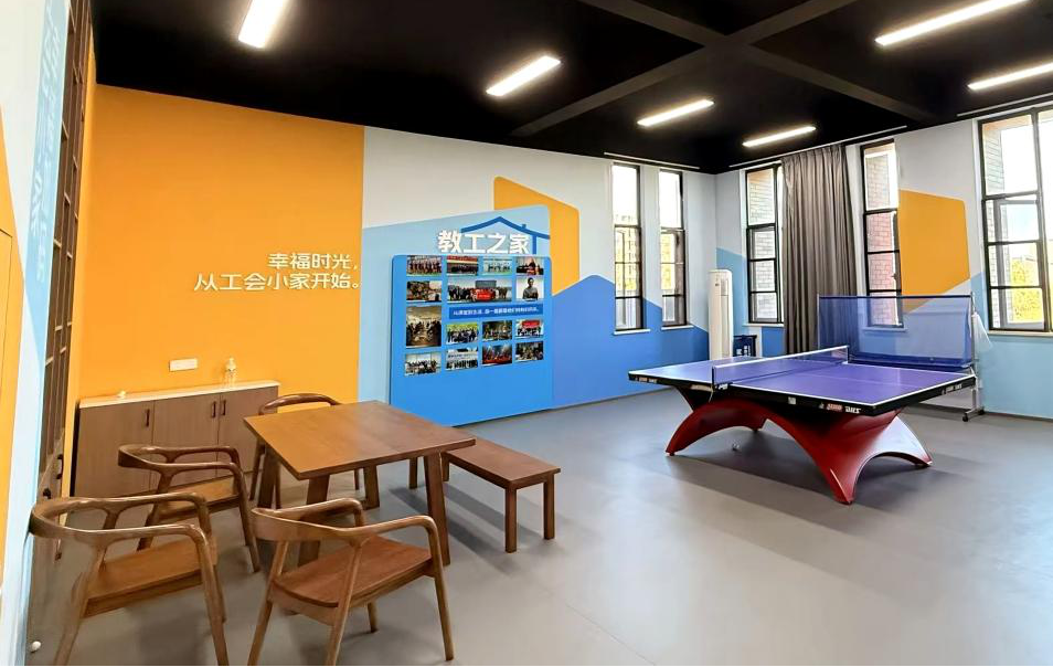 自今年4月份起,公司依据教职工实际需求,对教工之家建设进行了深入调研、精心设计及安排施工,历经五个月的努力,于9月份顺利完成建设任务,成功打造成为一个集运动、交流、服务功能于一体的综合性职工活动阵地。整个建设过程中遵循“实用、便捷、温馨”的原则,活动面积50余平方米,其中运动区域配置了乒乓球台等体育器材,以满足教职工的锻炼需求;交流区域设置了适宜的家具,旨在为教职工提供一个良好的交流环境;服务区域则配备了必要的服务设施,为教职工提供便利。