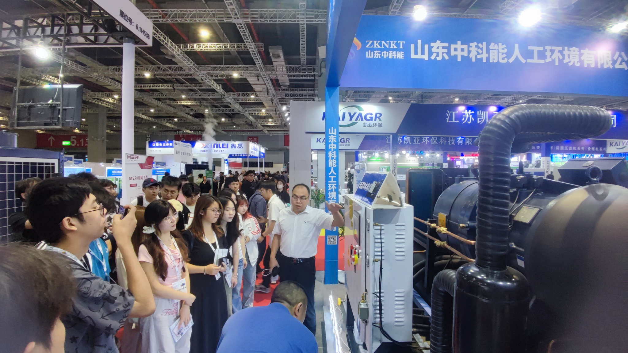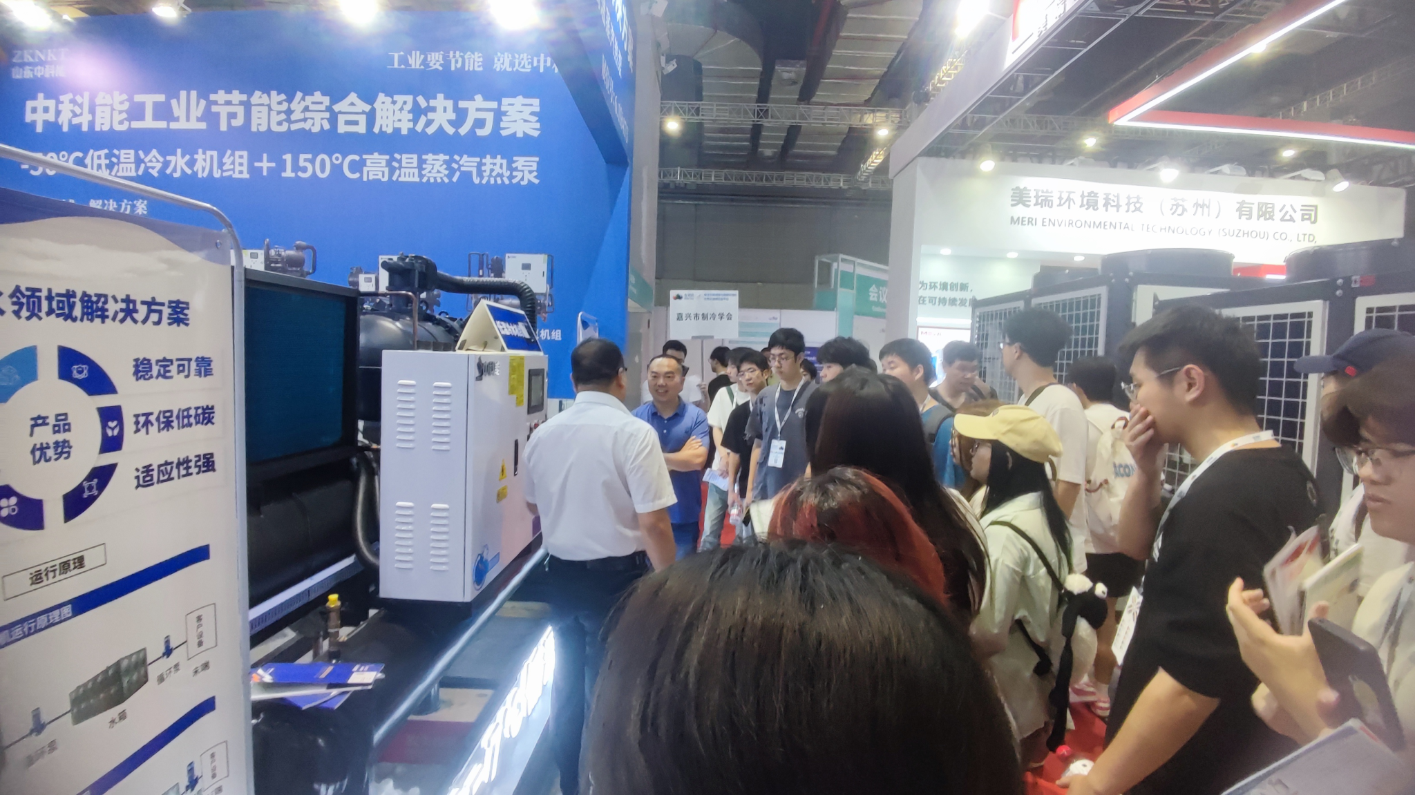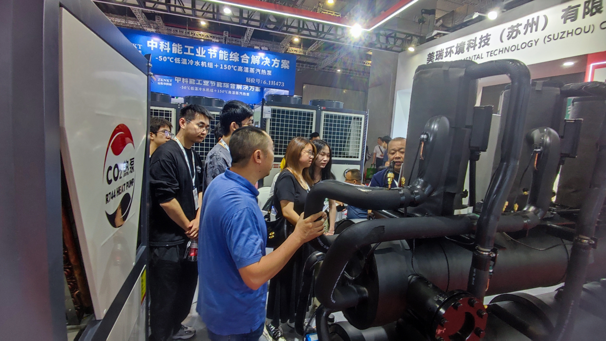 在展览现场,师生们参观了50余家企业的创新产品,包括高温热泵、CO₂冷媒机组等尖端设备。建环2023级员工王袁菲表示:"亲手接触到热泵设备实物,让我们对课本中的热力学原理有了更直观的理解"。在同期举办的"2025工业节能减碳论坛"上,师生们就热泵技术在食品烘干、纺织印染等场景的碳中和应用,与厂商技术代表进行了深入交流探讨。