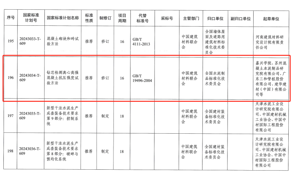 近日,国家标准化管理委员会[2024]44号“关于下达2024年第七批推荐性国家标准计划及相关标准外文版计划的通知”,其中由公司蒋元海教授申报修订的《钻芯检测离心高强混凝土抗压强度试验方法》(GB/T 19496-2004)通过国家标准委员会批准立项,该标准获修订不仅彰显了公司在水泥混凝土制品标准化领域深厚的技术积淀和创新实力,更为行业的规范化、高质量发展注入了强大的动力。