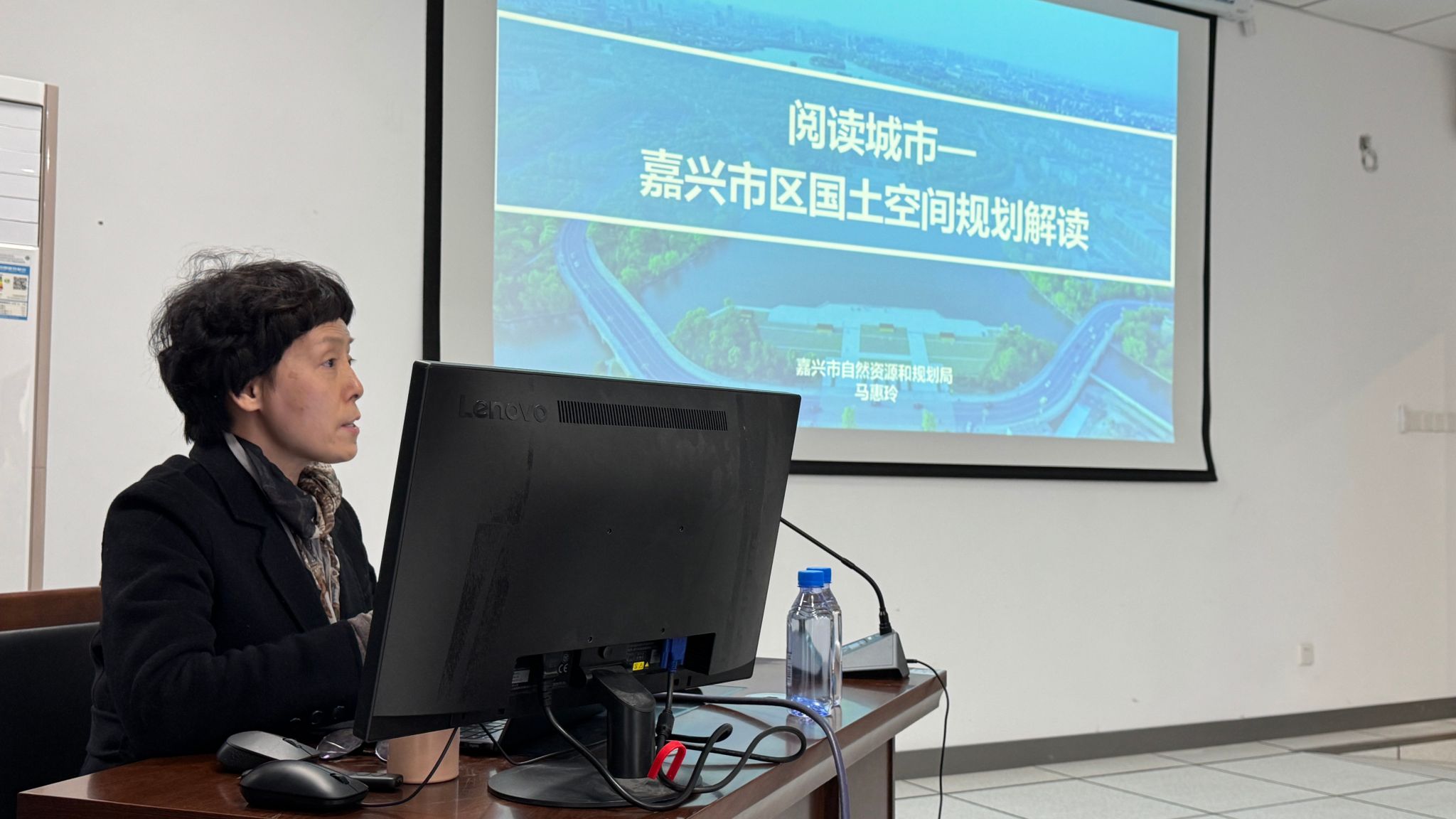 马处长首先从嘉兴城市定位、嘉兴市空间发展规划的发展历程谈起,详细向在场师生展现了嘉兴市重要板块的规划,并从大运河和沪嘉城际两个方面描述了嘉兴丰富的城市文化和未来的发展格局。据马处长介绍,当前的规划旨在构建“一城六镇·三楔九水·田园环抱”的国土空间总体格局,形成“九水连心、三楔九湖、田园绕城”的生态空间格局,以及“1个区域中心城市+6个特色城镇”的城镇空间体系。此外,她还详细阐述了嘉兴市区范围内“二港四网四通道”的综合立体交通协调发展新格局,以及近期实施的重点项目,如城市创新区建设、亚太路科创带建设、运河湾新城建设等。