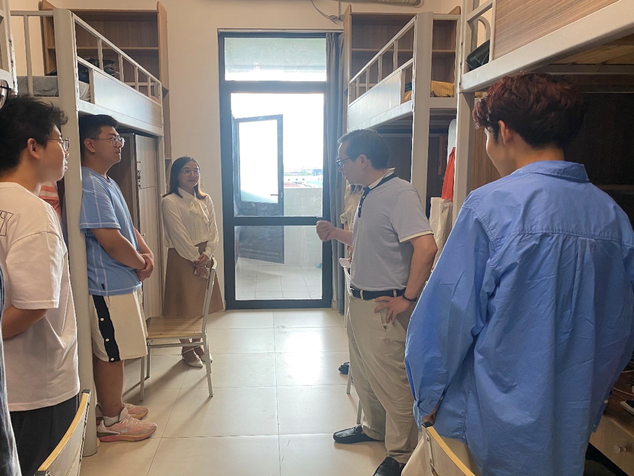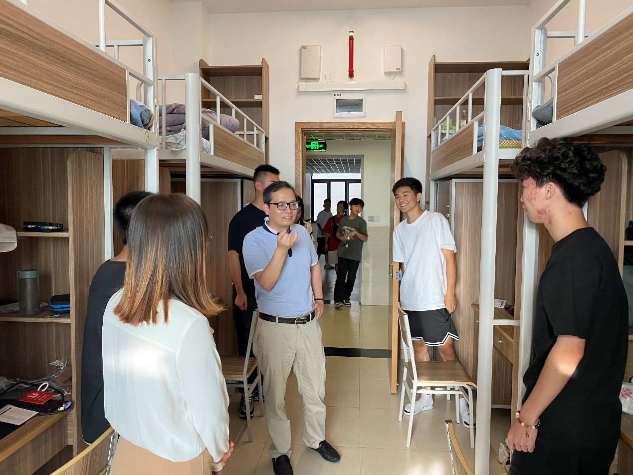 8月27日下午,副董事长周宏伟在建工公司党委副书记杨智慧、辅导员庄峰和俞纪良的陪同下走访了2023级新生宿舍,了解新生的住宿和生活情况,引导新生尽快适应新生活、新环境。