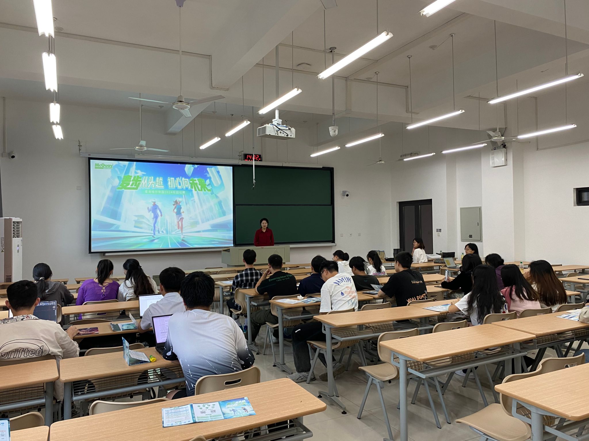 本场校园宣讲会主要面向公司建筑环境与能源应用工程专业2024届毕业生。麦克维尔集团招聘主管陈东文就公司发展历程、企业文化、人才培养、招聘需求等方面进行介绍。活动现场气氛热烈,企业耐心为同学们答疑解惑。随后,同学们进入笔试、面试环节。