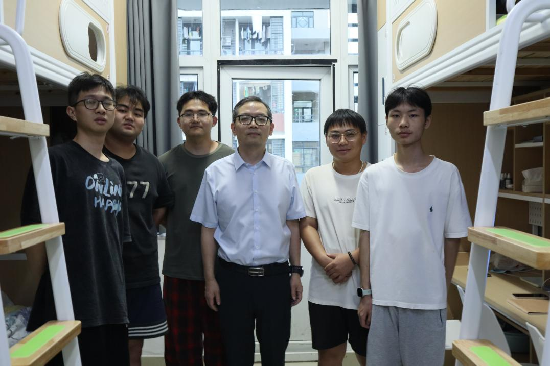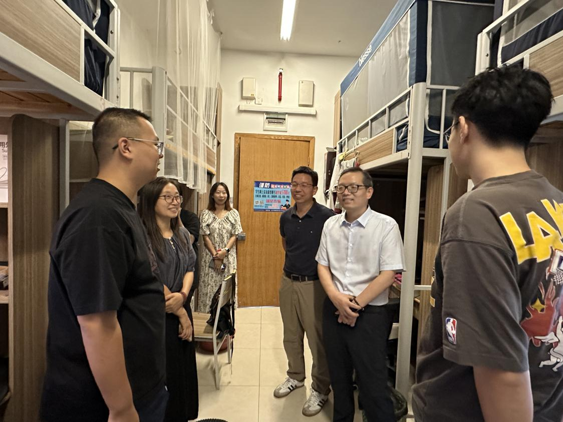 走访过程中,周宏伟副董事长与联系寝室的员工亲切交流,关切询问同学们返校后的适应状况,认真了解大家在学习、生活等方面遇到的困难与需求。在2025级新生寝室,他勉励同学们要以积极心态迎接大学新生活,在适应新环境的过程中尽快找到学习节奏,以崭新面貌投入学业与生活。周董事长指出,大学是人生新的起点,要珍惜时光、用知识武装自己,努力学习专业知识,不负青春年华。