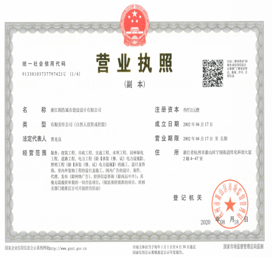 浙江润浩城市建设设计有限公司成立于2002年,历经近二十年的发展,目前颇具规模,开展主要业务方向市政行业(道路工程)专业甲级;建筑行业(建筑工程)甲级;风景园林工程设计专项甲级;市政行业(给水工程、排水工程、桥梁工程、公共交通工程)专业乙级;公路行业(公路、交通工程)专业乙级。现有职工约280人,其中注册人员11名,高级工程师75名,中级工程师146名。