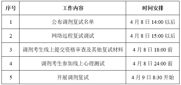 公司硕士研究生复试将采取网络远程复试方式进行,调剂复试安排初定如下,如有变更另行通知: